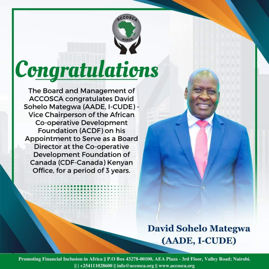 According to the African Confederation of Co-operative Savings and Credit Association (ACCOSCA), Mategwa will serve as a director at CDF-Canada, Kenyan office, for a period of three years.